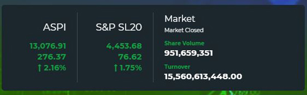 The ASPI closed at 13,076.91 points at the end of trading today, marking an increase of 2.16 % (276.37 points) from the previous day.