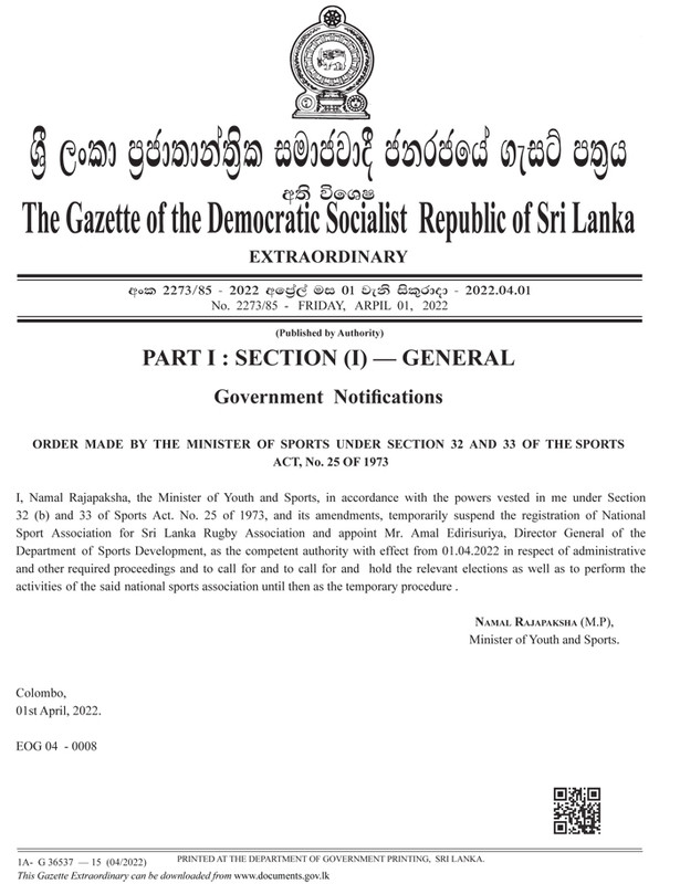 This was announced in a special gazette notification issued on Friday (April 01), in accordance with the powers vested in the Sports Minister under Section 32 (b) and 33 of Sports Act. No. 25 of 1973, and its amendments.