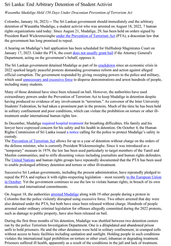 They urged the Sri Lankan authorities to immediately impose a moratorium on the use of the PTA, and promptly repeal it. “The authorities should immediately review the detention of anyone held under the PTA, ensuring adequate access to fair bail hearings. They should also release all protesters facing charges that do not meet international standards.”