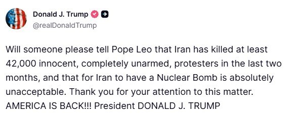 In the first, he asks for someone to “please tell Pope Leo... that for Iran to have a nuclear bomb is absolutely unacceptable” and claims Iran has killed “at least 42,000” protesters over the last two months.